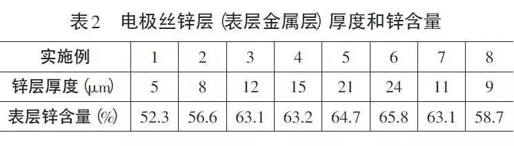 (6)成品加工:本工序采用退火+塑性加工+退火的在線技術,根據加工階段的不同工藝參數組合,將電極絲性能調整到材料所要求的導電性能與力學性能及如表2所示的表層鋅含量。
